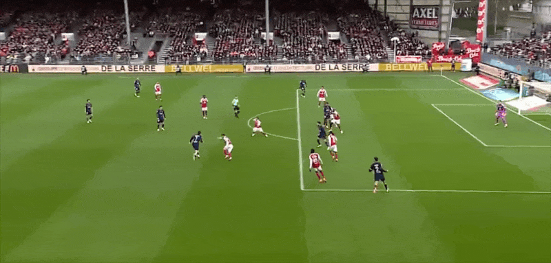 87’布雷斯特前场反击,巴尔德单刀机会失去平衡打门被扑