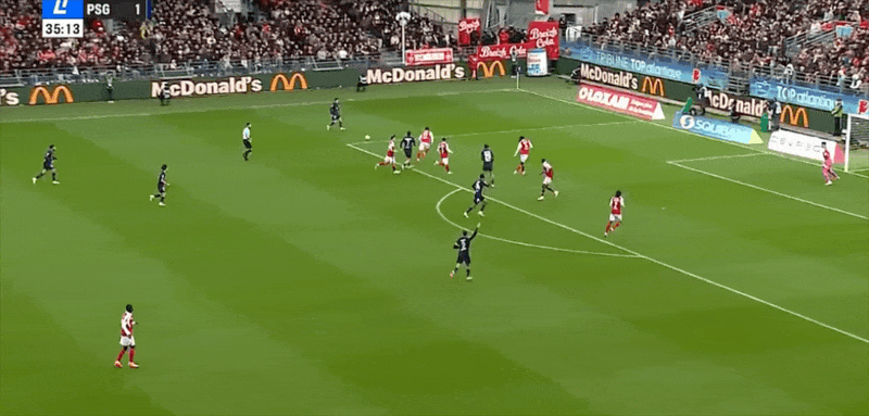 36’维蒂尼亚灵性做球,马尤鲁尝试一脚外围射门弹地轻快被守门员没收