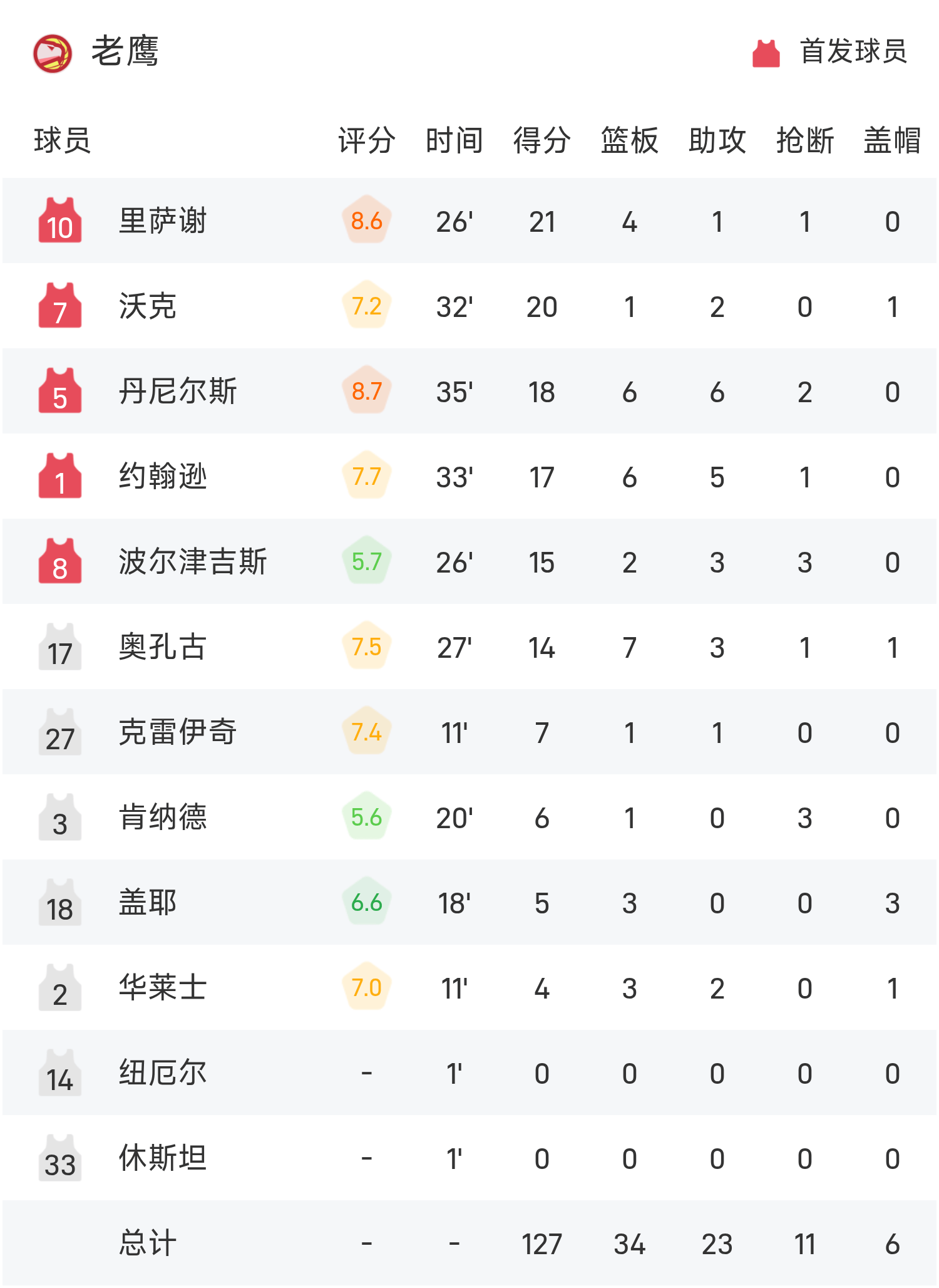 NBA战报:里萨谢21分,老鹰127-112轻取魔术