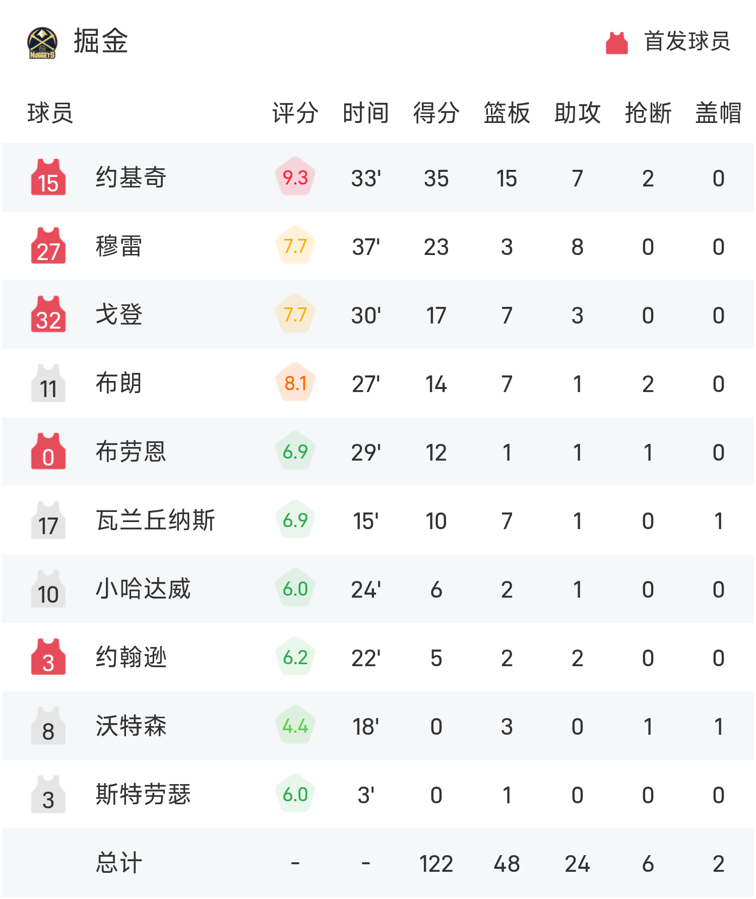 约基奇砍下全场最高的35分15板7助,率领掘金胜利取胜。