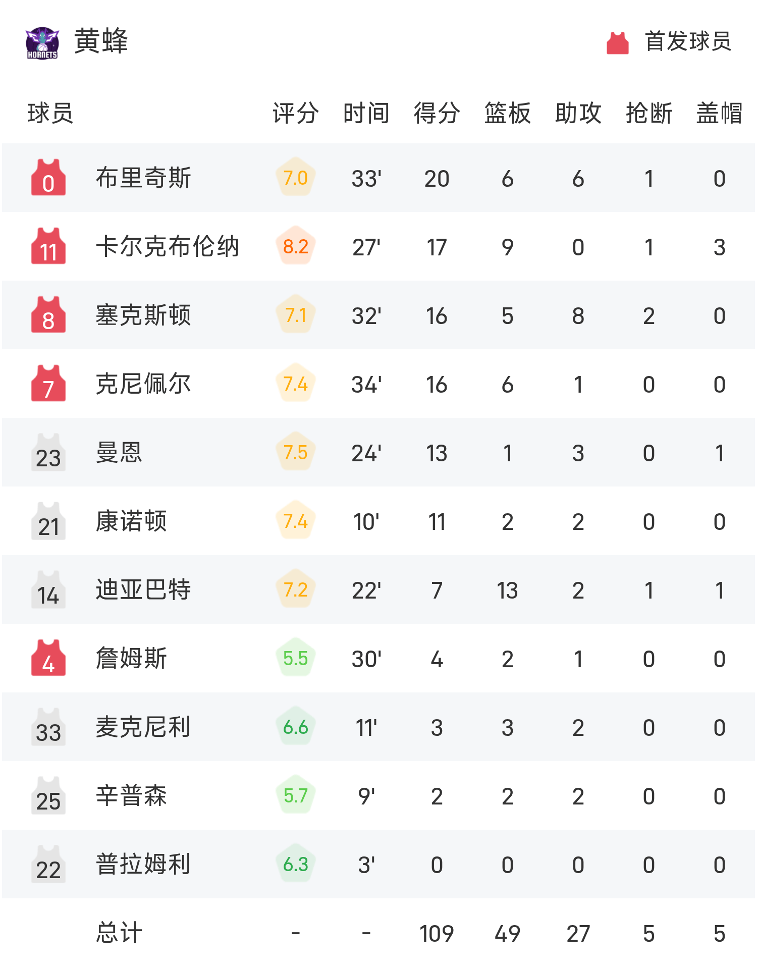 NBA战报:布里奇斯20分6板6助,黄蜂111-100击败雄鹿