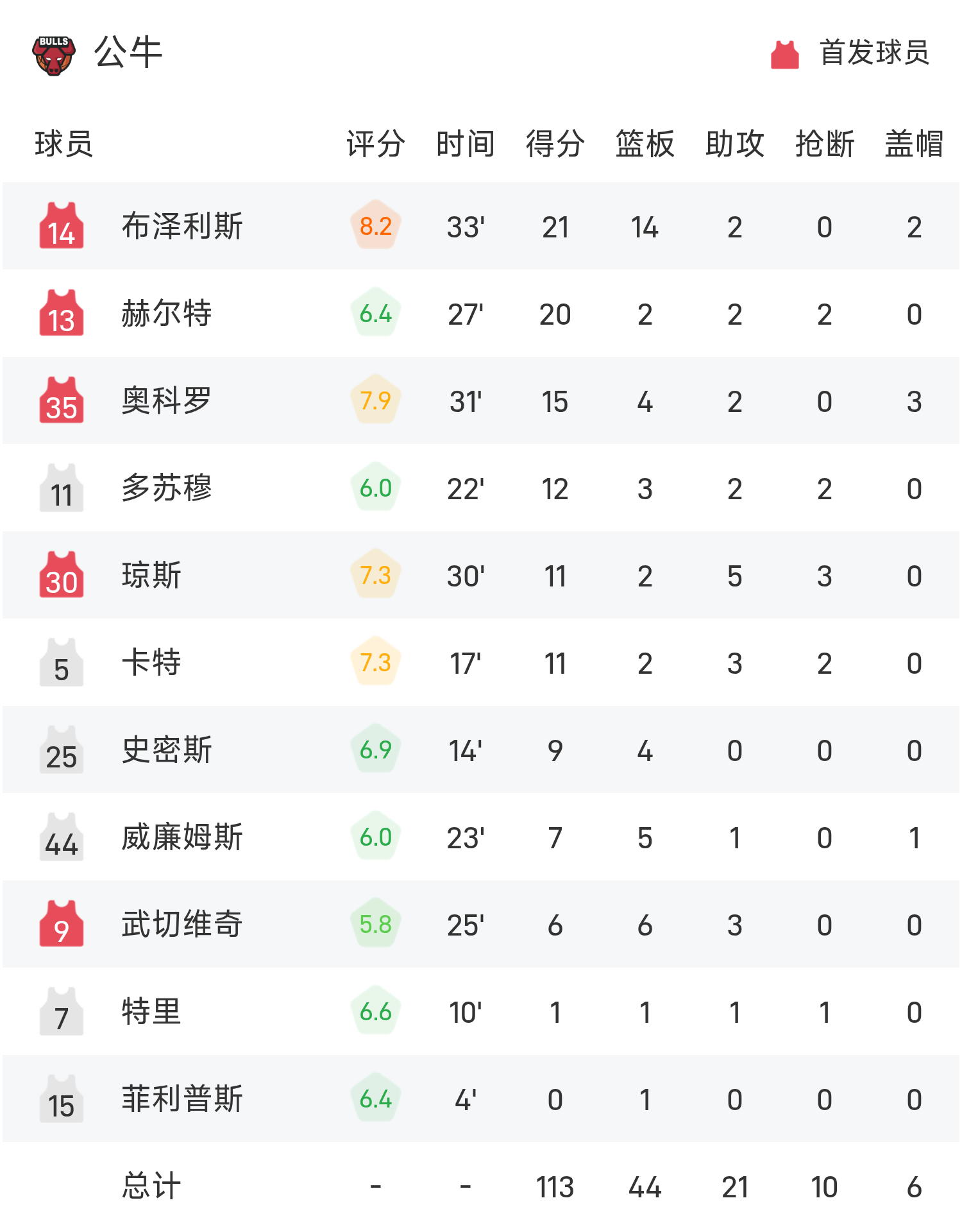 双方全场战罢,活塞124-113战胜公牛。