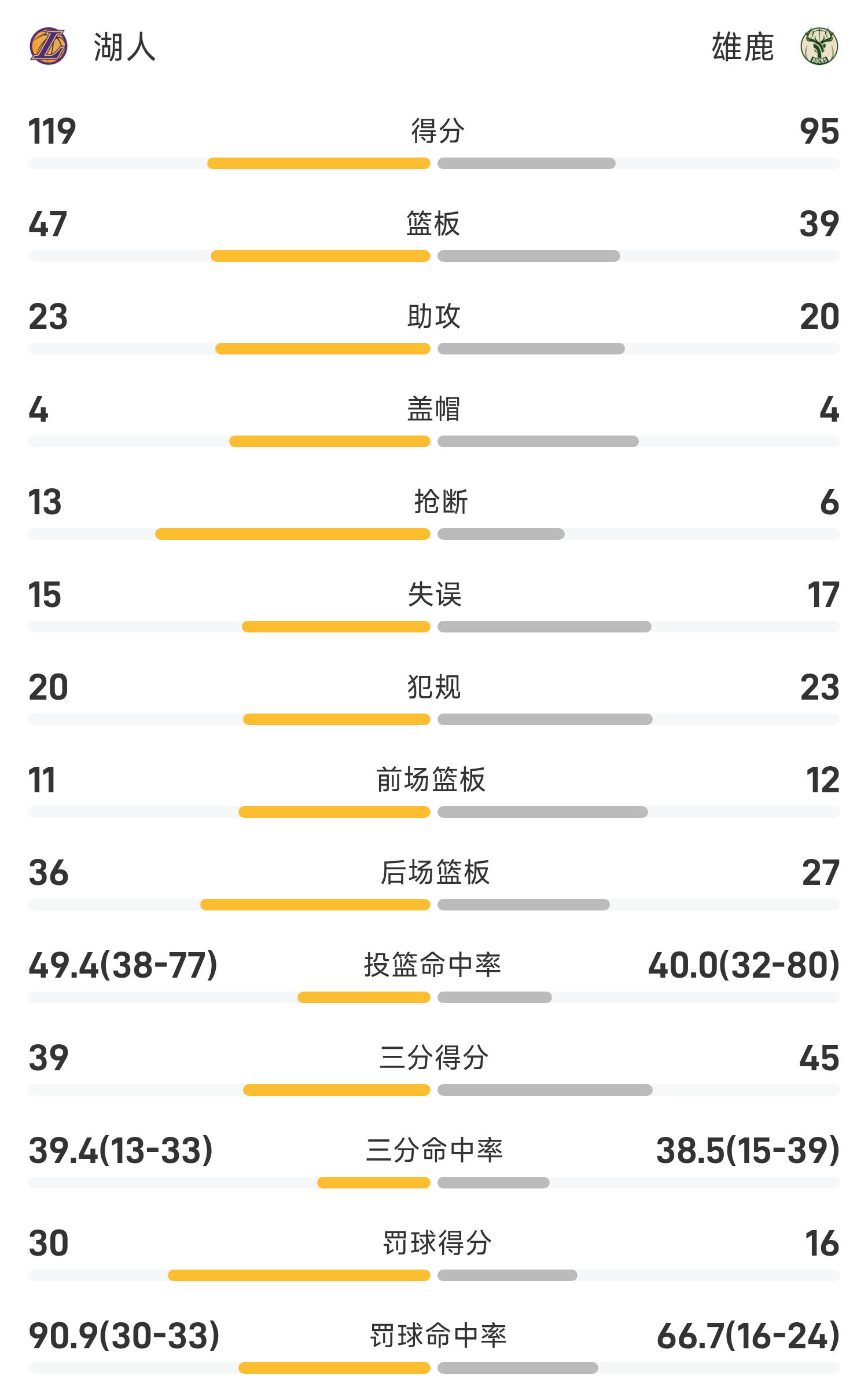 双方全场战罢,雄鹿95-119不敌湖人。