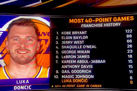 这是东契奇本赛季的第4次单场40+,湖人生涯的第6次单场40+,职业生涯的第50次单场40+。