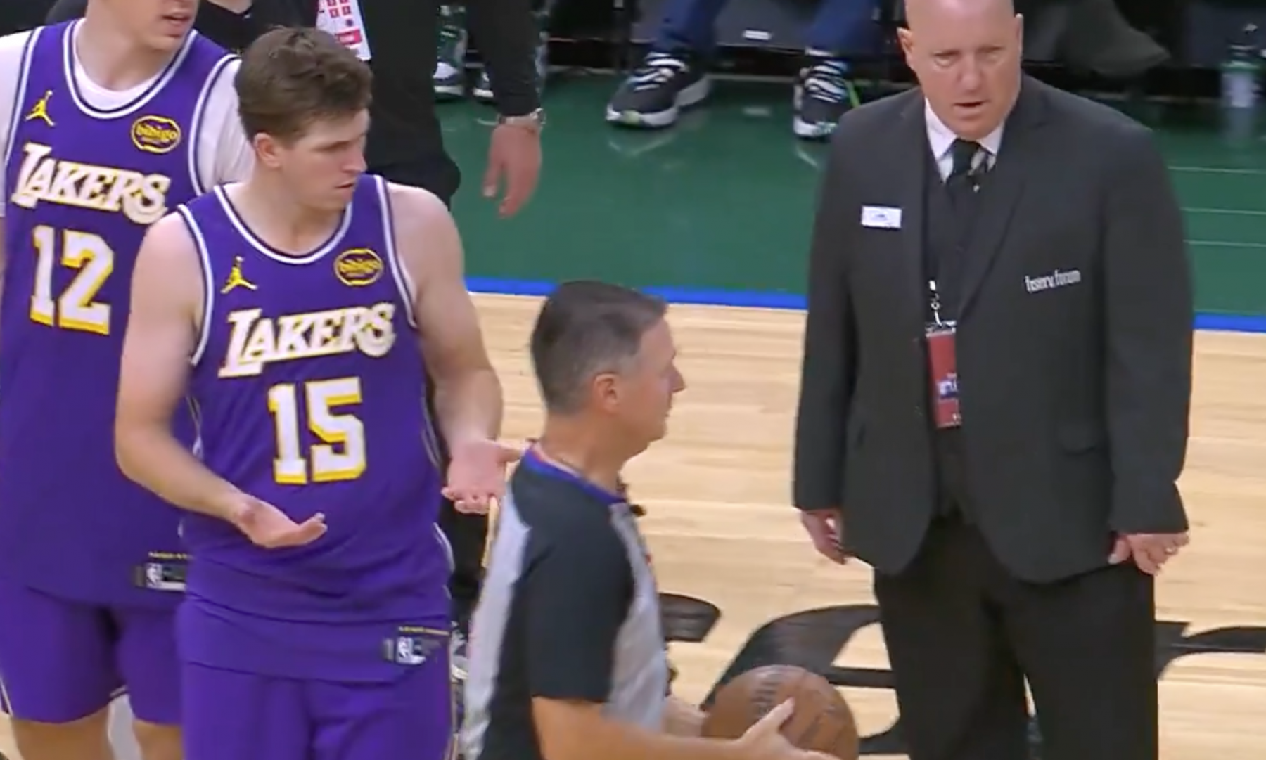 值得一提的是,竞赛终结后,湖人球员范德比尔特想拿走竞赛用球,但裁判员看到后直接过来阻拦了范德比尔特,东契奇示意这个球是要送给蒂耶罗留作生涯首秀纪念的,按照NBA惯例,新队员拿到生涯首分或首秀,都可以拿走竞赛用球,而拉拉维亚、八村塁、里夫斯也先后过来与裁判员沟通,但裁判员最终还是拿走了竞赛用球。