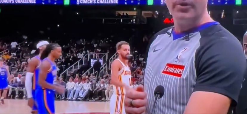 美媒晒出一段视频:特雷·杨在雷霆挑战胜利裁判员宣布改判时,在裁判员身后对着裁判员做出大拇指向下的动作表达不满。