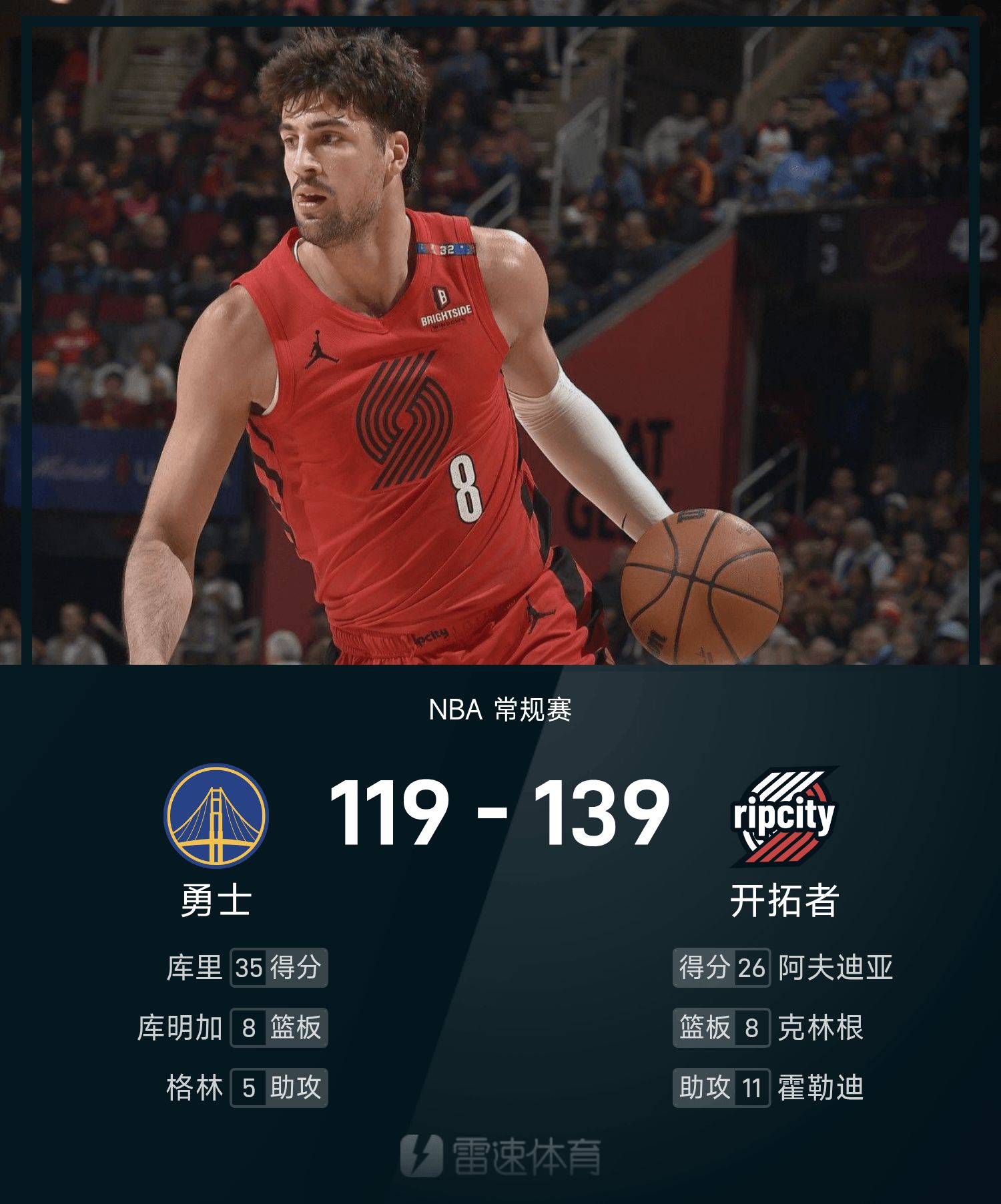 6686体育10月25日讯 25/26赛季NBA 常规赛,开拓者对阵勇士。双方全场战罢,开拓者139-119战胜勇士。阿夫迪亚得到26分5板6助率队取胜,库里空砍全场最高的35分6板3助。