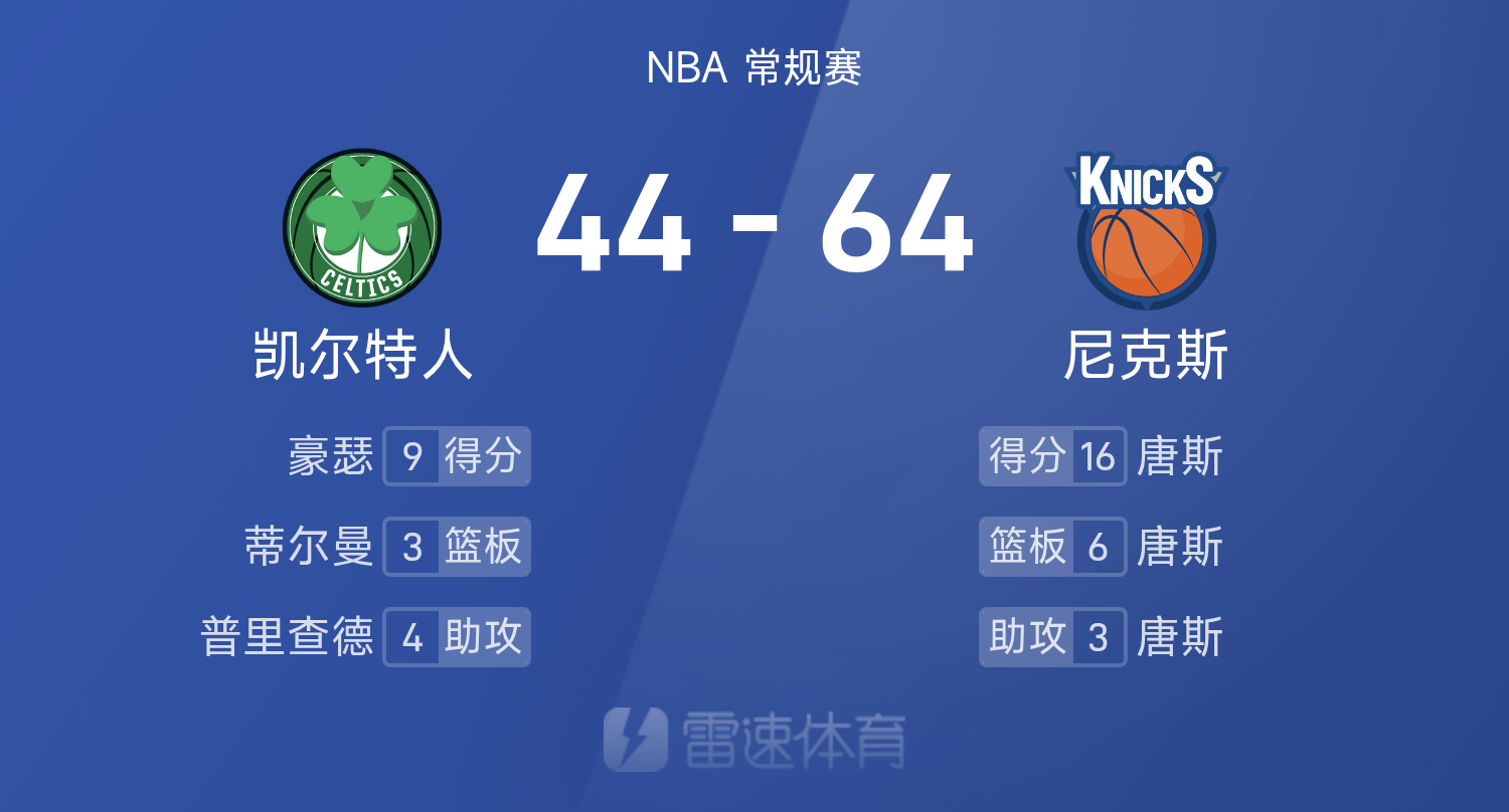 6686体育10月25日讯 25/26赛季NBA 常规赛,尼克斯对阵凯尔特人。双方半场战罢,尼克斯64-44领跑位凯尔特人。