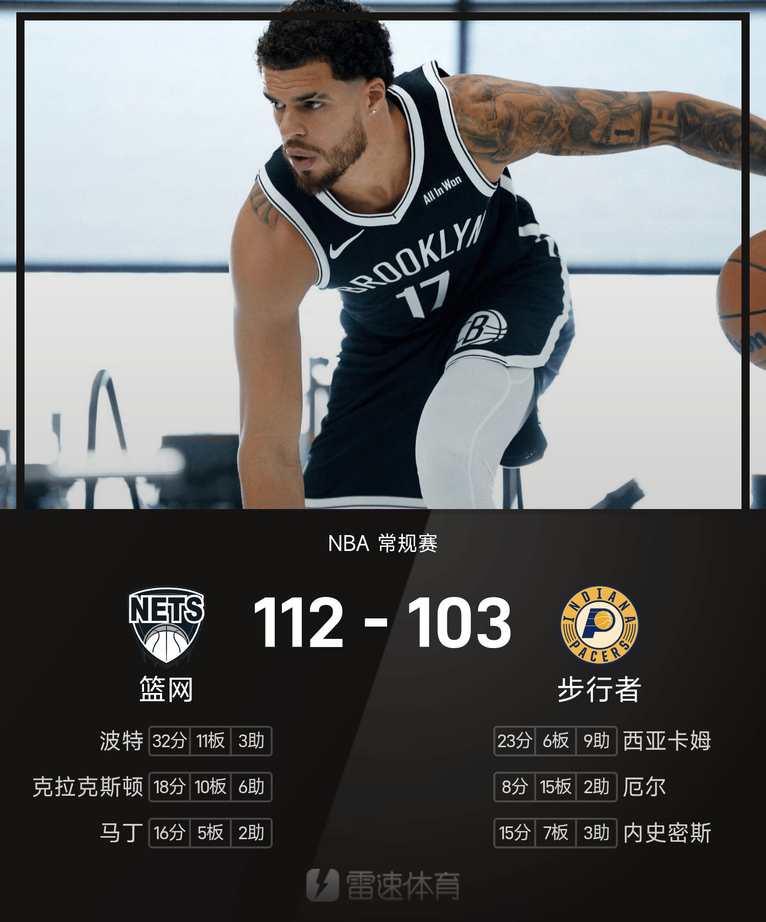 NBA战报:小波特32分10板,篮网112-103步行者