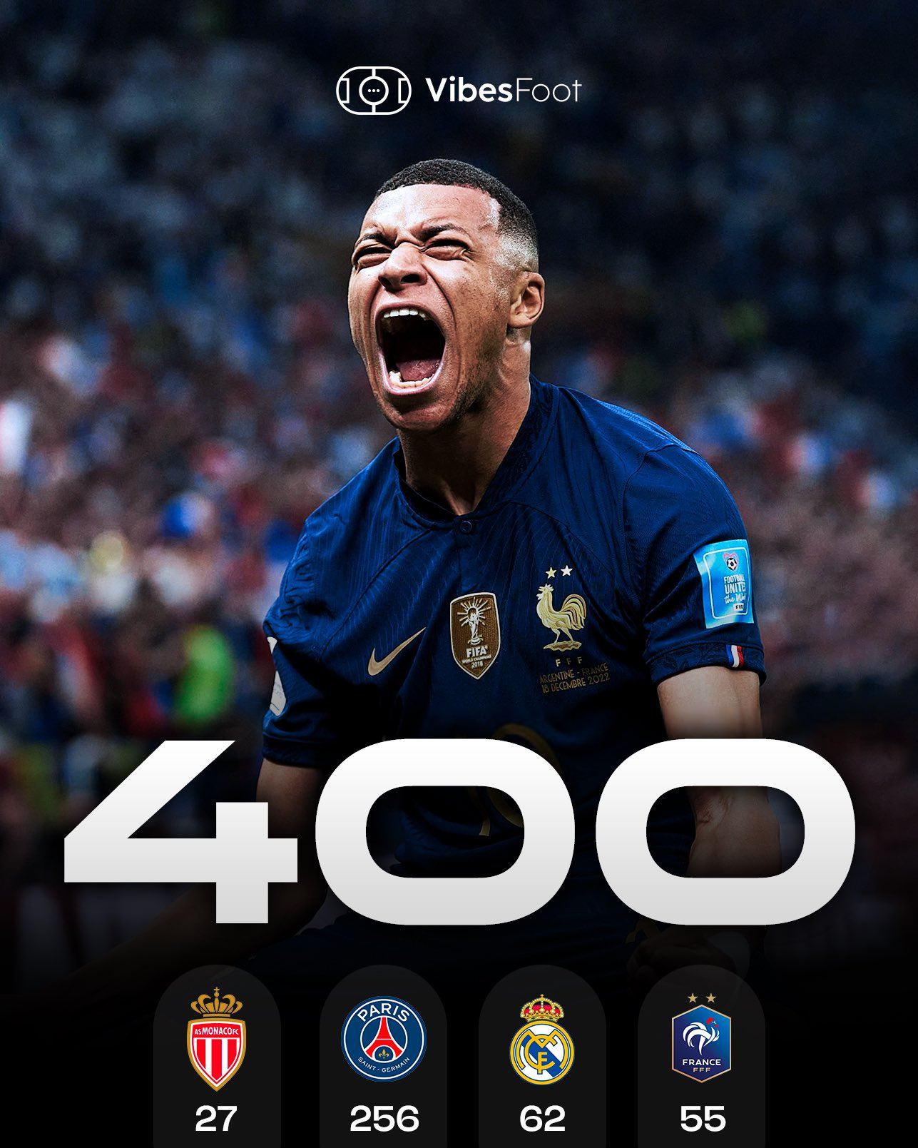 6686体育11月14日讯 世欧预倒数第二轮,姆巴佩梅开二度,法国4-0击败乌克兰,获得世杯赛入场券。而姆巴佩也达成了职业生涯400球里程碑。