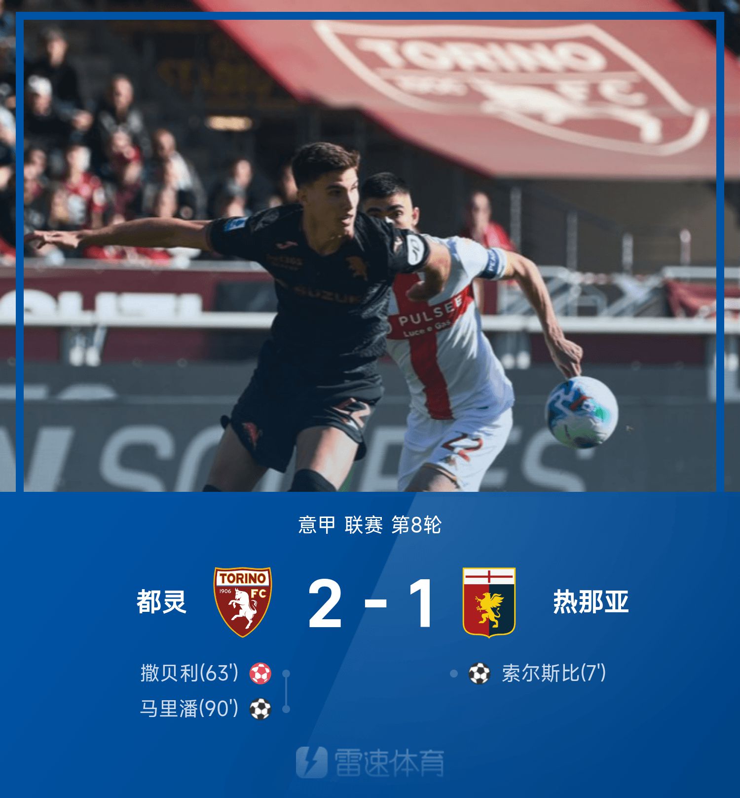 6686体育10月26日讯 25/26赛季意甲联赛事第8轮,都灵2-1战胜热那亚。上半场索尔斯比抢点闪击得手,但下半场风云突变,撒贝利送乌龙协助都灵扳平赛果分,最后时刻中后卫马里潘完成最后一投。